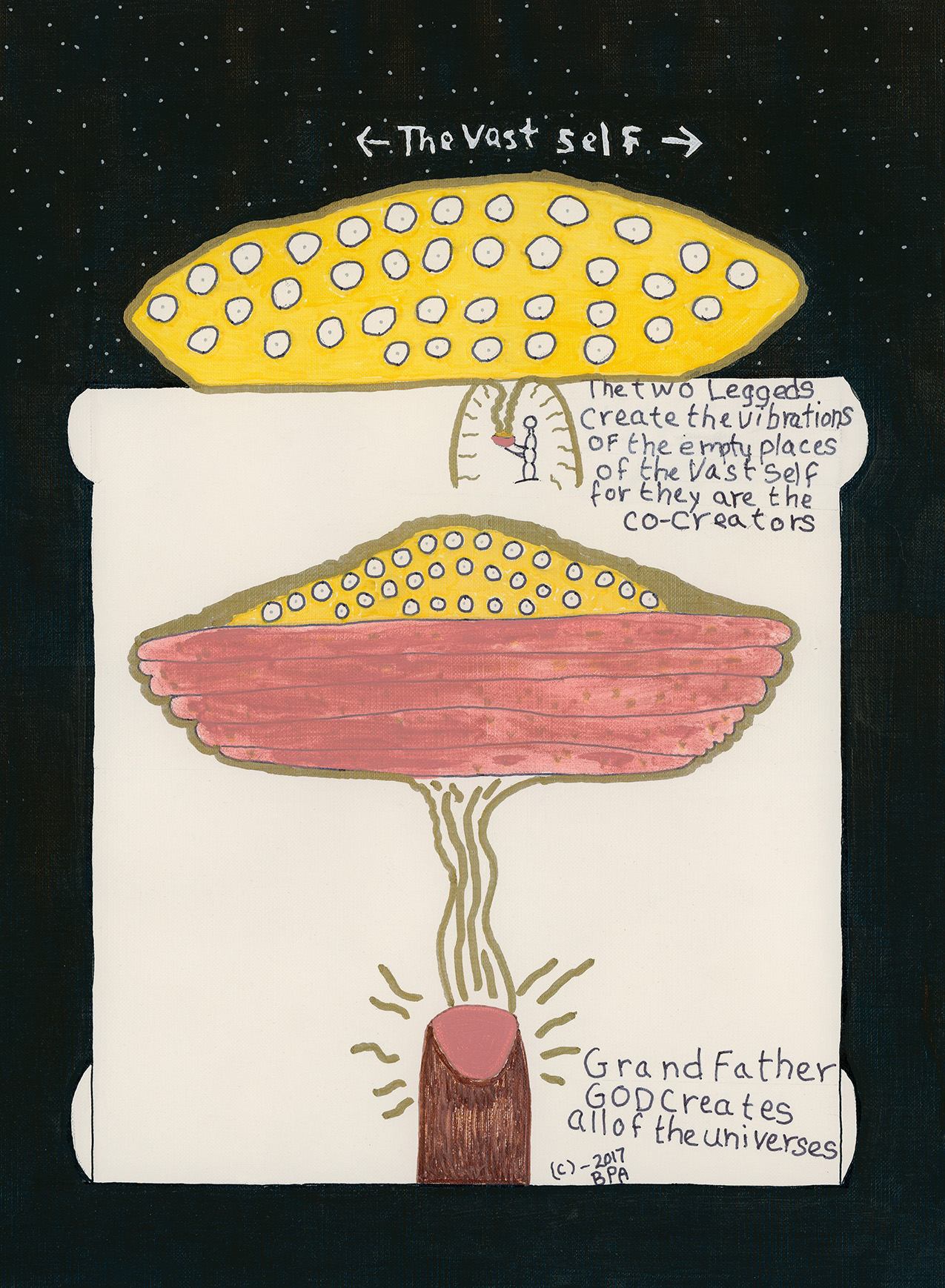 In the painting, the pottery bowl emanates from Grand Father God’s fingertip. It is filled with cornmeal. The small, human figure also holds a bowl filled with cornmeal (the way non-ordinary reality works the same bowl can appear in different realities). Joseph wrote near the human figure, “The two Leggeds create the vibrations of the empty places of the Vast self for they are the co-creators.” Vast self is another term that Joseph uses sometimes for God or Wah-Mah-Chi. We also partake in vast self, but not when we are full (of ourselves, or of beliefs and ideas), but only when we are empty. It is only in the emptiness of our non-existence that we can create the space for vast self to manifest.
